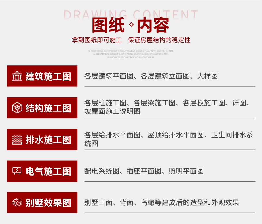 建筑平面圖:一層平面圖,二層平面圖,三層平面圖; 建筑立面圖:東立面圖,西立面圖,南立面圖,北立面圖,剖面圖; 大樣圖:樓梯詳圖,細部大樣,門窗大樣 |